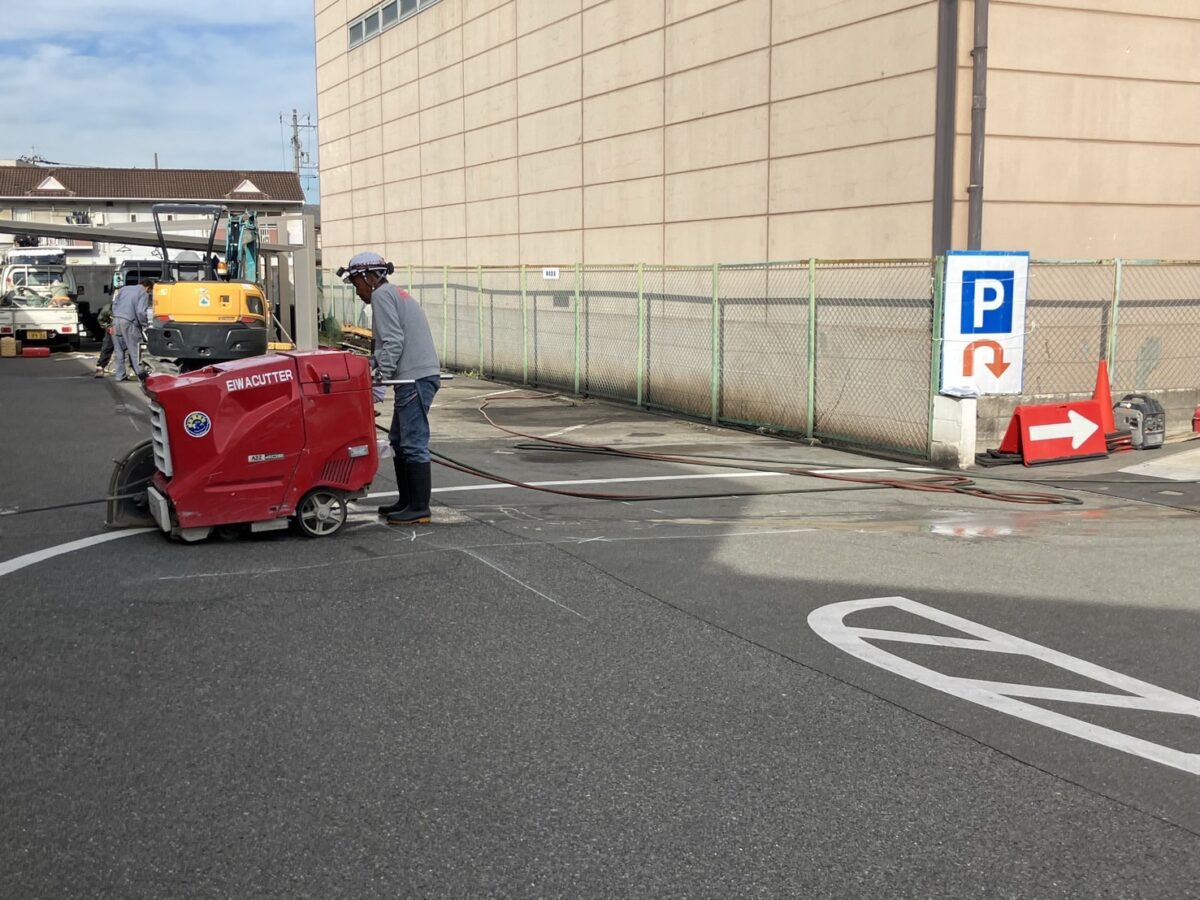 赤い大型カッターで地面を丁寧に切り込みながら、
