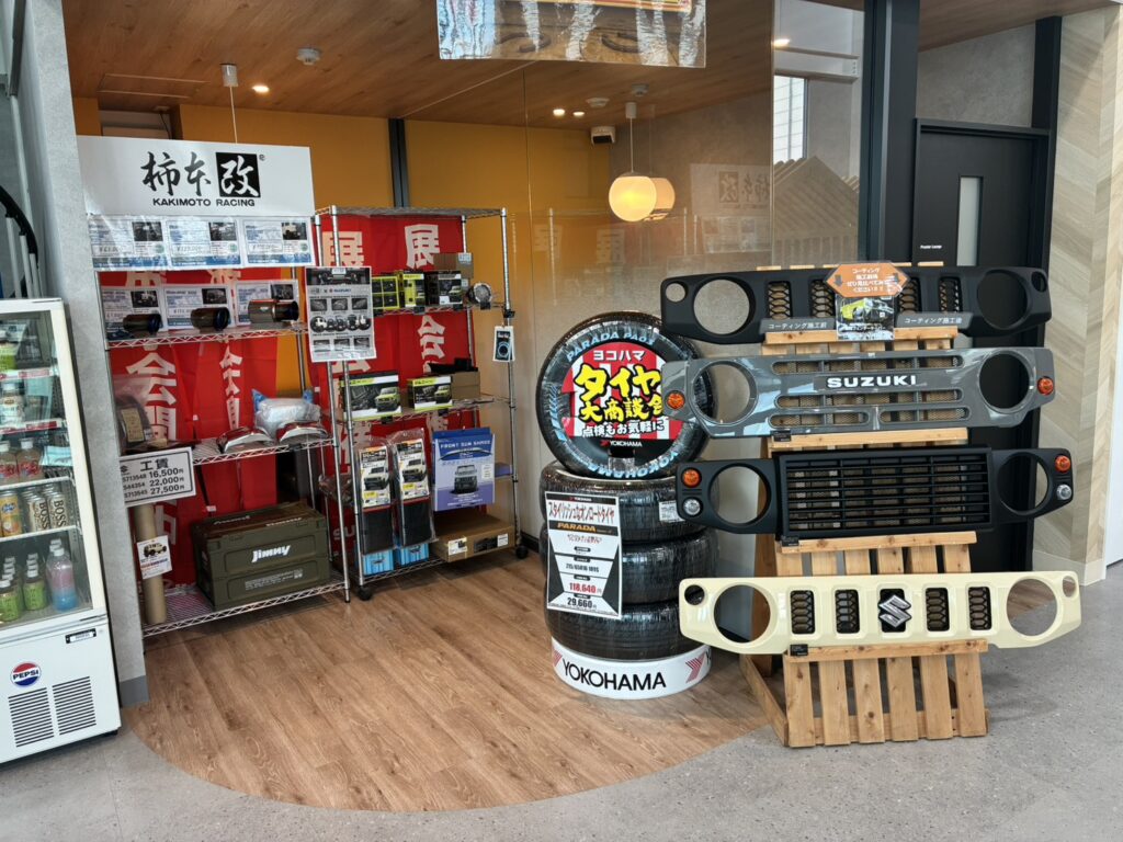 店内に入るとまず目に飛び込んでくるのが、写真に写っているジムニーブースの特設ディスプレイで、グリルや専用アクセサリーがずらりと並んでいて思わずワクワクしちゃう空間になっています👏