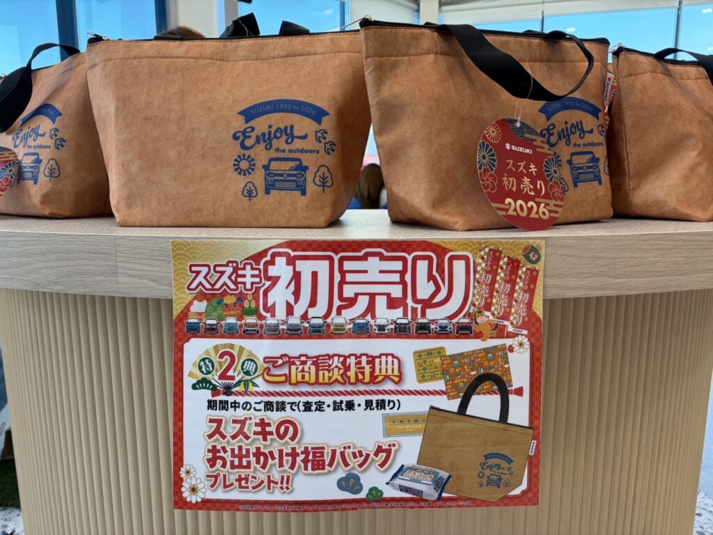 写真にもあるように、「スズキ初売り2026」のロゴ入りお出かけ福バッグがずらりと並び、思わず目を引く華やかな雰囲気でした😊