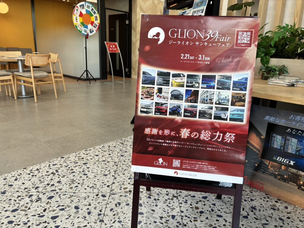 外にはGLION39Fairののぼりが並び、いつもと少し違うワクワクした雰囲気🚗