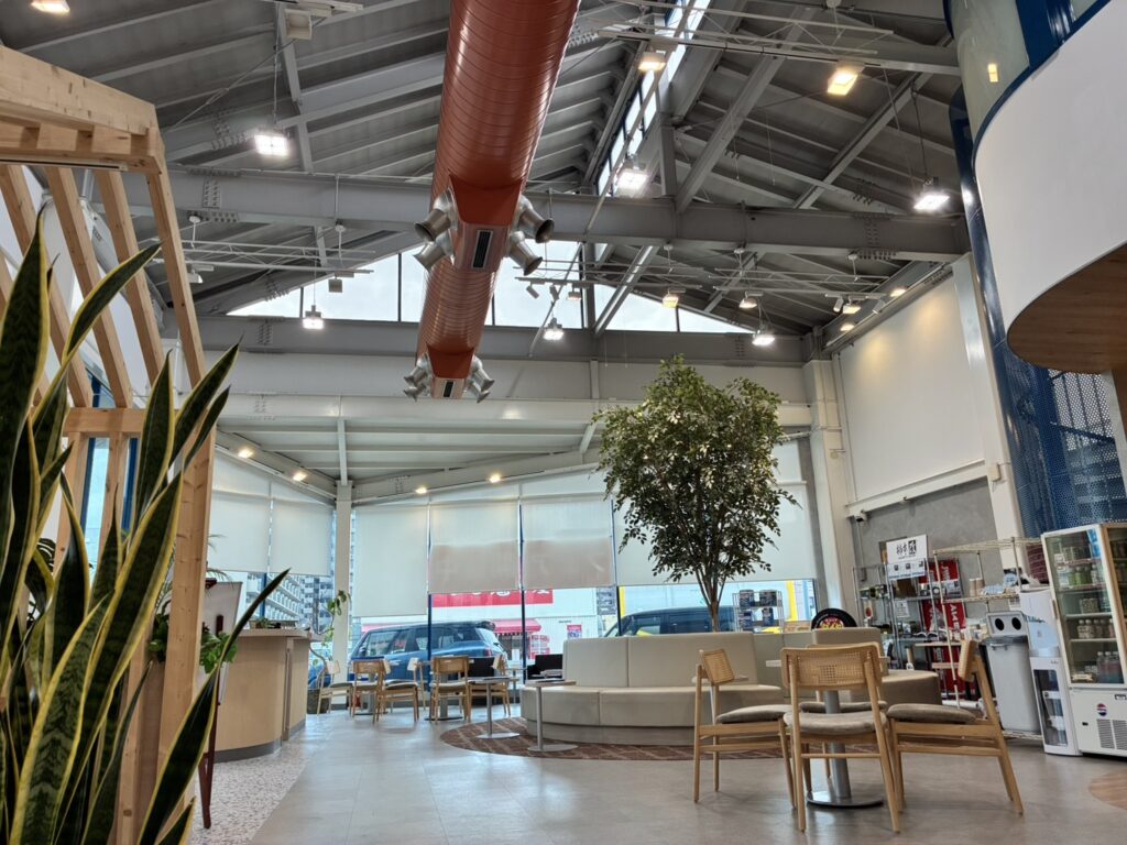 お車の点検や整備の待ち時間でも、ゆったり過ごしていただけるような環境になっていますので、初めてご来店される方からも「おしゃれなショールームですね」と言っていただくことも多いんですよ😊