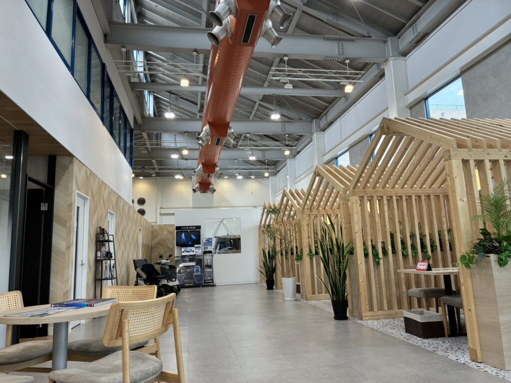 スズキアリーナ堺北は2025年5月に店内をリニューアルし、最新のデザインを取り入れ、各所に緑も沢山配置しました。